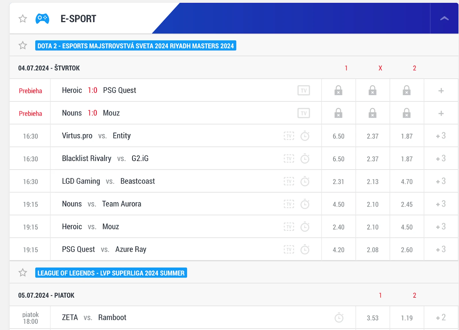 Tipovať sa dá na rôzne hry a rôzne turnaje. Ako príklad môžeme uviesť hru DOTA2, no obľúbenou možnosťou je aj superliga League of Legends. Ponuka však zahŕňa aj hru Valorant a hráči môžu využiť možnosť staviť si na dlhodobé stávky v majstrovstvách sveta v hre Counter Strike.