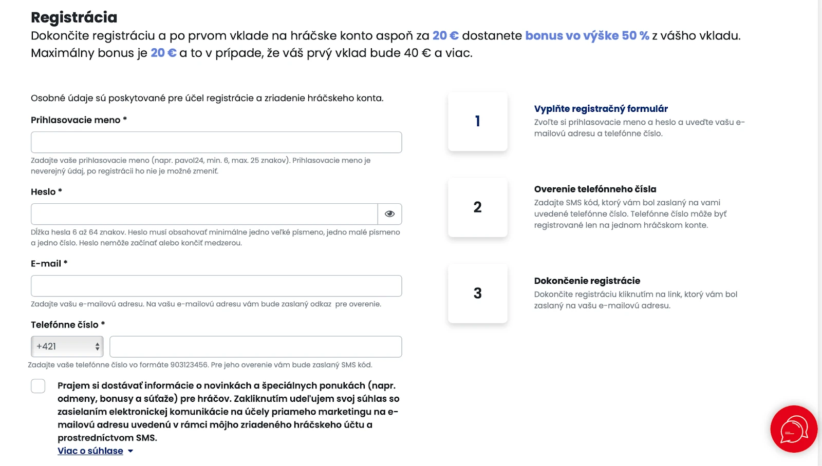 Každý hráč, ktorý úspešne dokončí registráciu a na svoje konto vloží minimálne 20 eur, dostane bonus vo výške 50 % vkladu. Maximálna výška bonusu je 20 eur a túto sumu tipér získa, ak jeho prvý vklad na účet bude vo výške 40 eur a viac. Aby sa tipér k bonusu dostal, svoje konto musí navýšiť do 30 dní od registrácie.